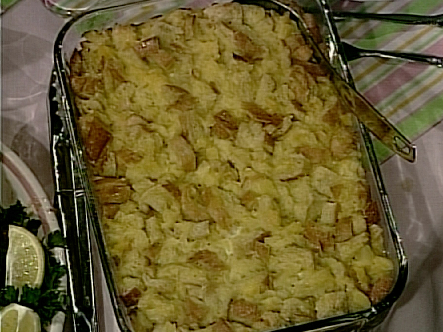 - In a large bowl, combine the undrained pineapple with salt, sugar and flour. Stir in the beaten eggs. Toss bread cubes with the melted butter; fold into the pineapple mixture. Pour into a 2 quart casserole dish and bake in preheated 350 degree oven for 40 to 50 minutes. Makes 10-12 servings. Enjoy!