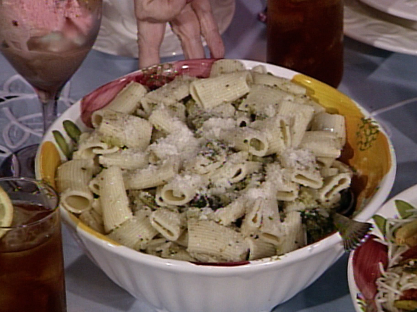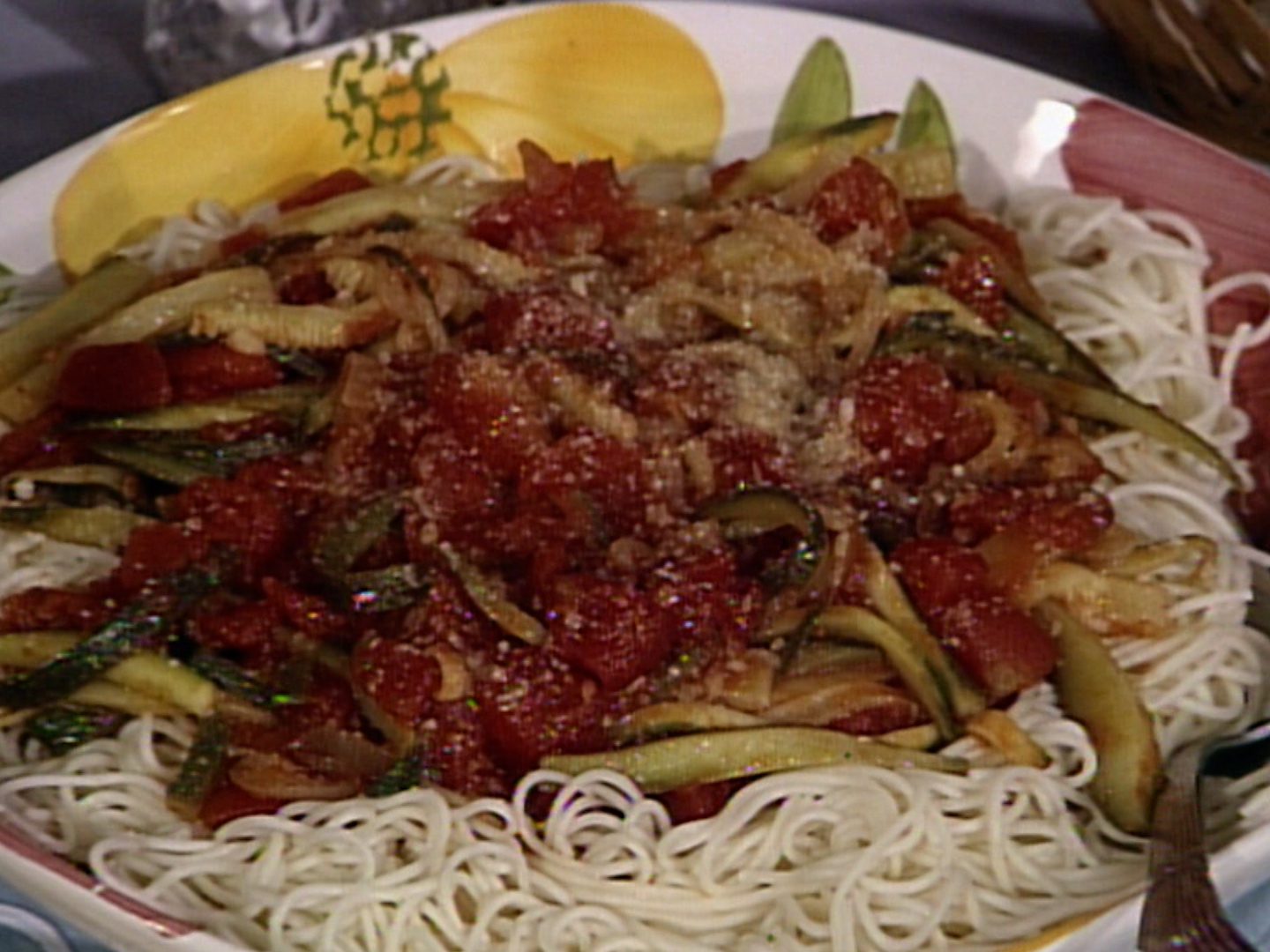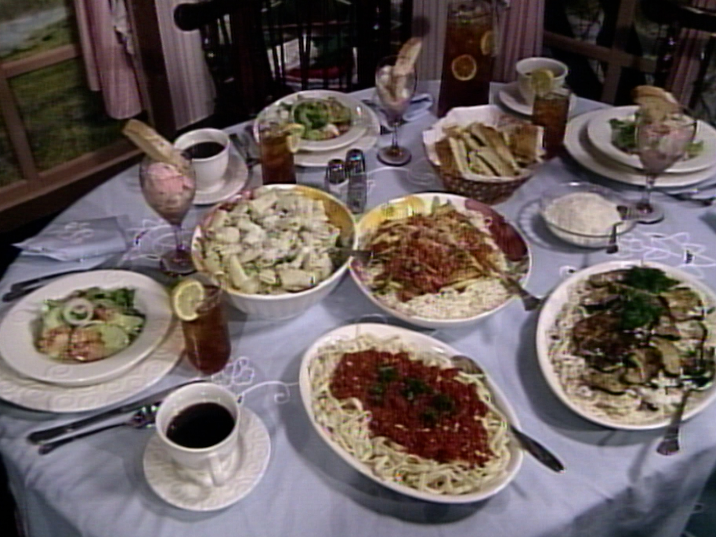 Well, we’re here at the table with all of the, I’m calling them harvest pastas because they have a lot of fresh vegetables in them. This is the broccoli. Isn’t this wonderful? Broccoli and rigatoni with the cheese on top. In front of it is our marinara sauce that we put on a nice flat noodle. Next to it here is the zucchini and tomato sauce. We put that on the capellini or the angel hair pasta, real fine pasta. And in the front is the eggplant and spaghetti that has a ricotta cheese, and oh my goodness. And there’s not a bit of meat in any of these dishes. We’ve added some garlic bread. We added a nice, little tossed salad and some iced tea with it. And for dessert, how about a scoop of spumoni and a biscotti? What more could you want for a really delicious pasta meal? Any one of these can be made in about a half hour. The one with the eggplant takes a little longer because you have to brown the eggplant, each of the slices, but it’s well worth it. Trust me, it really is. You know, sometimes you tell me when you write for the recipes that you don’t see the number on the screen or you don’t hear it, when you’re requesting it, then just say, “I would like to have the recipes for the program that you did about pastas or about the meatloaf or about,” and we’ll know what you’re talking about. So if you have a difficult time because maybe the reception on your cable system or even just on your antenna isn’t real good, just mention what it was that we were preparing during the program, and we’ll be sure to get the right recipe out to you. Now, don’t forget that’s a self-addressed, stamped business-sized envelope sent to us with a little gift to help us with the cost that we have for printing, and we’ll be sure to get those recipes to you for that program plus the rest of the month’s recipes that go along with it. It’s always a pleasure to be with you. Remember that we really do love you, we care for you because you’re part of our family. It’s not just the people here that make up “At Home,” it’s you sitting right there watching each week, you’re part of our family. Thank you for being there. So until next time, be sure to join us because it just wouldn’t be the same without you. We’ll see you then, bye bye.