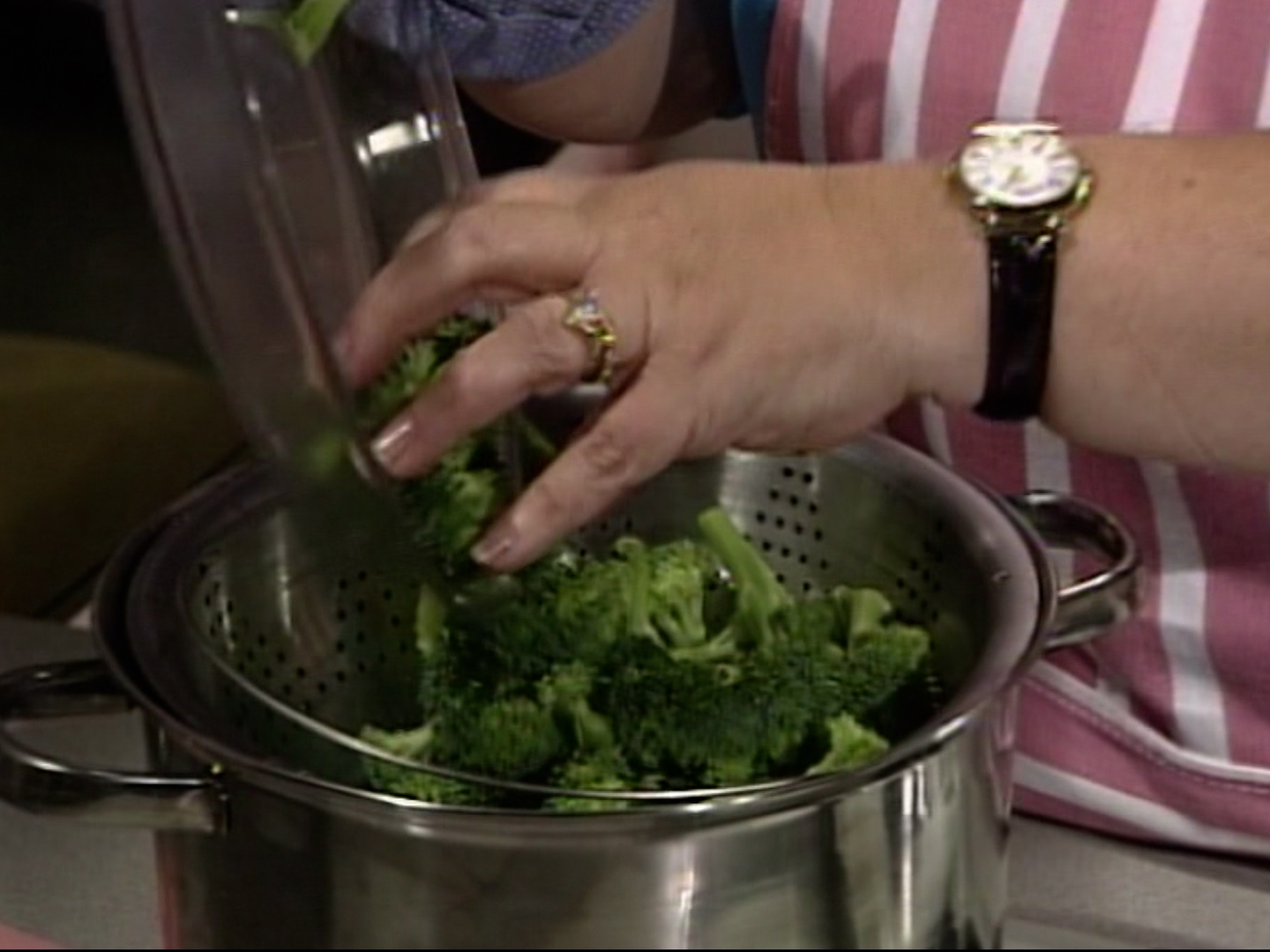 Episode AH2331A: Hello, welcome to “At Home.” So nice to have you with us. If it’s first time you’ve been watching, then, we welcome you. For our steady viewers, we’re glad that you’re with us again. I’ve just been reading through a cookbook and I thought it was very fascinating because they had some, some definitions here. Like how do you chiffonade. No, doesn’t anything to do with a chiffon cake or chiffon. It’s a way you cut some greens. And then there’s deglazing a pan. Parchment paper. I thought that’s what they wrote legal documents on. Then there’s proofing yeast. I know what that is. Toasting nuts and trussing. Trussing, interesting. Well, I though that just today we would do something about the cooking terms that we use most often when we’re making recipes. And we realize from the mail that we’ve been receiving that a lot of you are not familiar when I would say, “Do this, or do that, “or fold this in, or fold…” And so we thought we would do a program explaining the different things that a recipe calls for. The different terms. My mother-in-law, who is an excellent cook, went to church one time and a lady, friend of hers, was telling her how she makes a particular dish. And she said, “Oh, you know, I do this.” And my mother-in-law said, “Oh, I make it too.” She said, “Well, I saute my onions “and my celery and my peppers in butter.” My mother-in-law said, “Oh, I don’t. “I fry mine.” Well, it means the same thing and she didn’t know that. They had a good laugh. She’s good nature so she took it in stride. But it is embarrassing if you don’t know what the particular term means. So today, we’re coming to terms with cooking terms. And we’re gonna get started with the ten most used, widely used cooking terms in recipes and explain what we mean by each one of them. And we’re gonna get started in just a moment. We’ll be right back. Here’s today’s At Home Hint. Avoid the urge to cut or slice freshly baked pies or cakes until they are completely cooled. If you’ve got a helpful hint that you’d like to share, we want to hear from you. Send your hint to At Home Hints, CTV, Wall, Pennsylvania, 15148-1499. CTV, Wall, Pennsylvania, 15148-1499. Welcome back. Okay today, the first cooking term that we’re going to talk about is saute. S-A-U-T-E. And the definition of saute is, “To cook food quickly in a small “amount of hot fat in a skillet.” Now, if you’ll look over here with me, I have a skillet with a little bit of butter. The butter is melted, okay. Now, that has got to be the state of the butter before you begin to saute. When you add whatever it is you’re sauteing. Whether it be celery, peppers, onions, whatever. When you add it, see how it starts to bubble there. That fat, whether it’s butter, grease, oil, whatever, has got to bubbling like that so that when you put your second ingredient in, it immediately begins to cook it. You’re not standing here waiting for it to happen. Saute is not frying because… This is a little bit high. You have to keep your fire down a little bit lower. You don’t want this to brown. Frying is browning. Sauteing is making the foods, like an onion would be transparent. You would know that that is sauteing, okay. This is what we call sauteing. If you keep it on much longer than that, it will be too brown and then it will turn into fry. You don’t want it to fry. It browns. So this is what you call saute, which means to cook food quickly in a small amount of fat in a skillet. That’s saute. Okay, that’s our first term. The second term that we’re going to do is steam, okay. Now, you have to have the right utensils and the right equipment to steam which means, “To cook in a covered saucepan “in a steamer basket or on a trivet “over a small amount of boiling water.” And as we have used on many of our cooking programs, this is an ideal steamer and this cookware is available at the Wholey Balcony Cookware who has supplied our wonderful cooking utensils and equipment here in our kitchen. This is a steamer basket. The water should come up almost to the bottom of the steamer. Inside the pot, it needs to be bubbling. You can see we’ve got this well in advance good and hot for us. And what you do is you place mostly broccoli, mostly vegetables that we steam. Cauliflower, green beans are wonderful when you steam them. Now, all you do… Corn in the cob is great steam too. All you do is lay them. Try not to have them bunched up but kind of level in the bottom and the key to this is, you see this little steam vent here, you want to be sure that the steam does not escape because the steam is what’s going to cook the food. So you close the little vent. And you put that on top. Now, if you’ll notice, the water does not touch the broccoli at all. The water does not touch the broccoli. It’s the steam that cooks it. Normally if you boil, you submerge the vegetable in a liquid or in the water. But when you steam, the vegetable is sitting on the top of the bubbling water, which causes the steam to keep coming up and the steam being this hot as it is, cooks the vegetable. What is so nice about that, you’re not boiling away all the nutritious value of your vegetable by steaming it. You have a bright green color. It stays beautifully green. And all the nutrients, all the vitamins and minerals, everything will stay in your vegetable. Broccoli is best this way. And you say, but how long does it take? Well, depends on how well done you like your vegetables. Now, I like it fork tender. I don’t like it to be mushy or real soft. I like it just to be able, crisp enough to get the fork in there and to pull it out without having to shake it off the fork. So that’s steaming. That’s our second cooking term. Now, let’s go to the third one which is scald. To scald means, “To heat a liquid “just until small bubbles form around the edge of the pan “but not allowing the